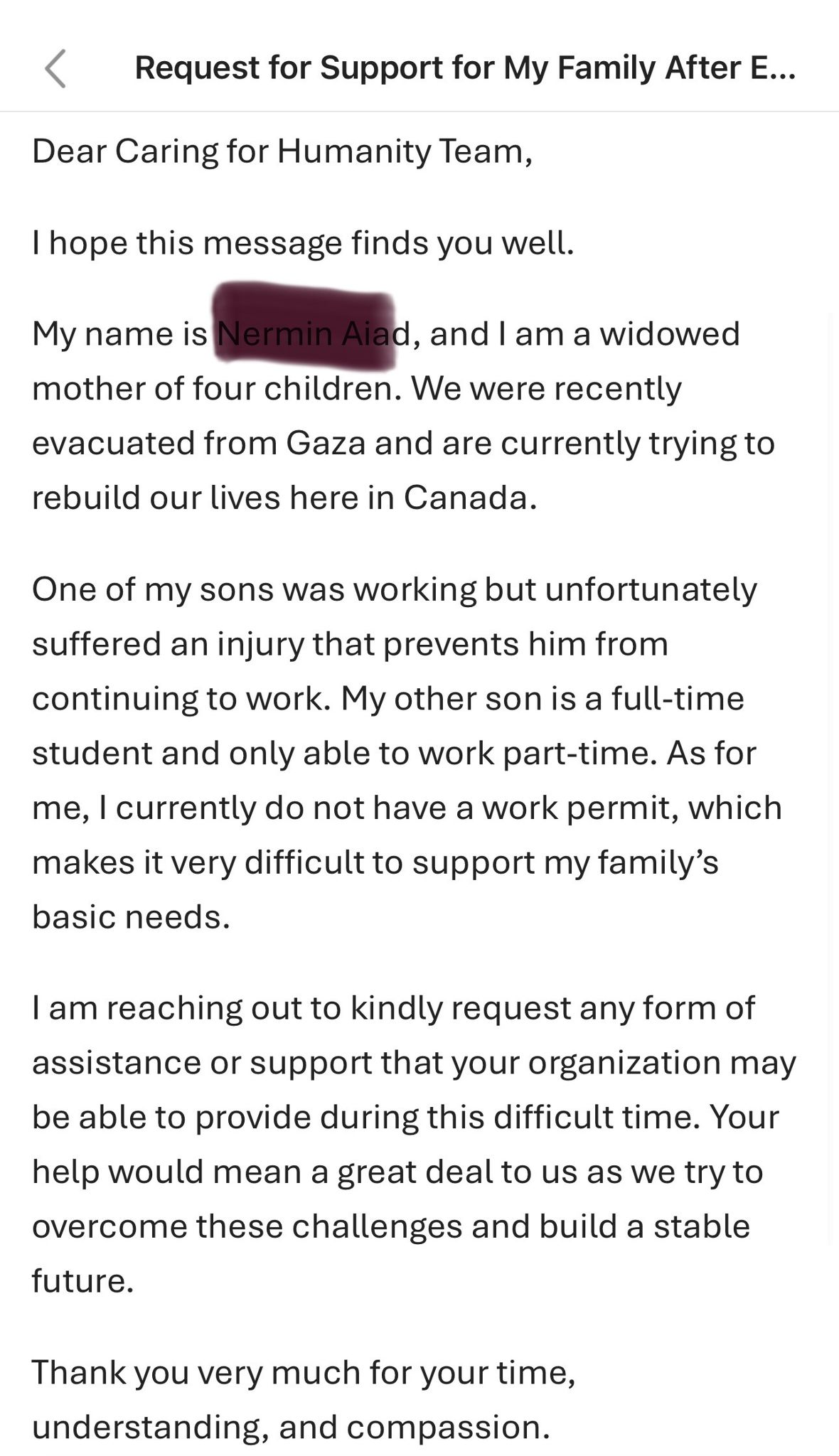 Alhamdulillah our organization Caring4Humanity has collaborated with Sister Eman Alkhouli who is a sincere, passionate and dedicated volunteer living in Toronto, Canada but originally from Gaza, Palestine and have done multiple projects and work with her for helping people in Egypt, Gaza and Canada .