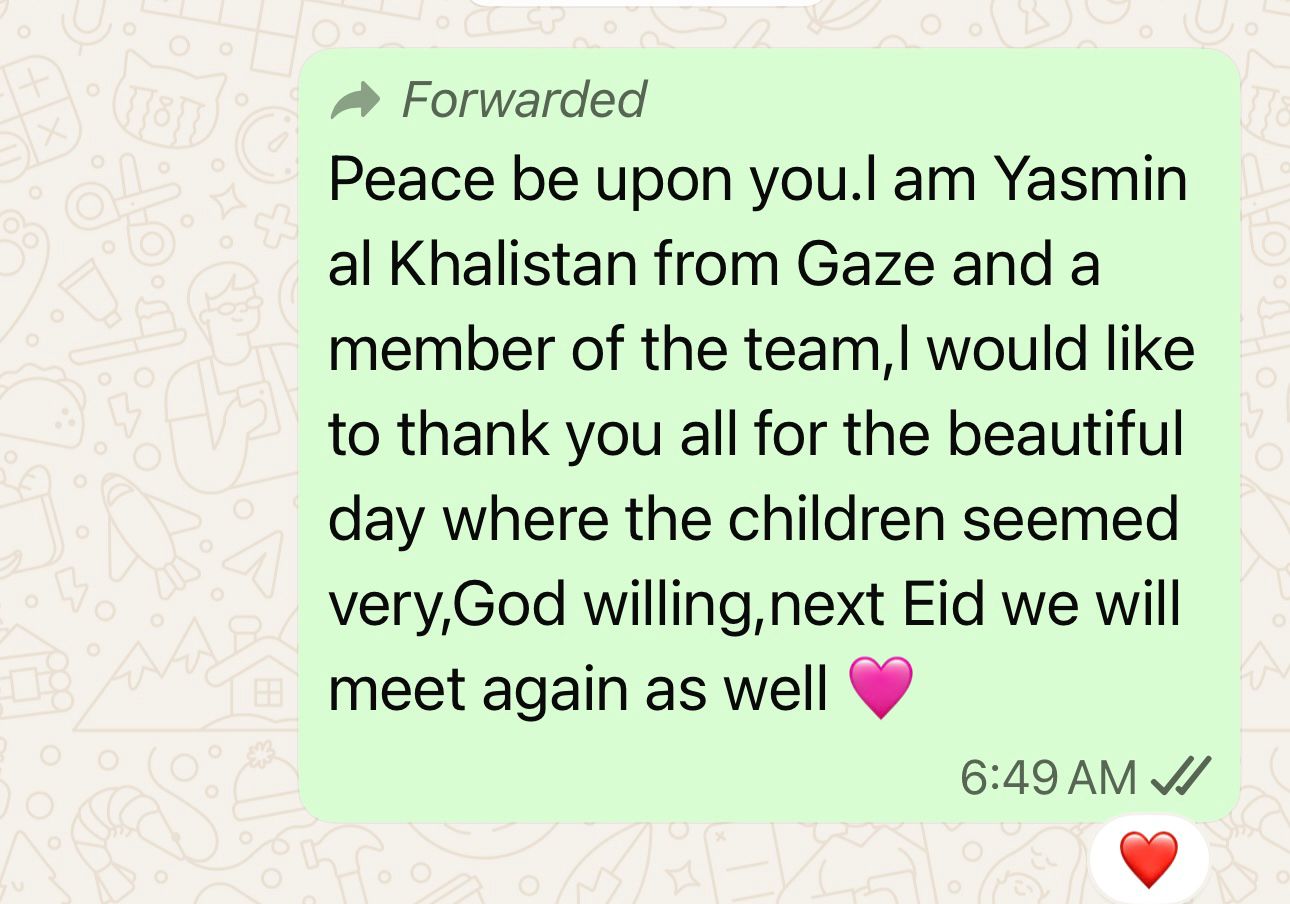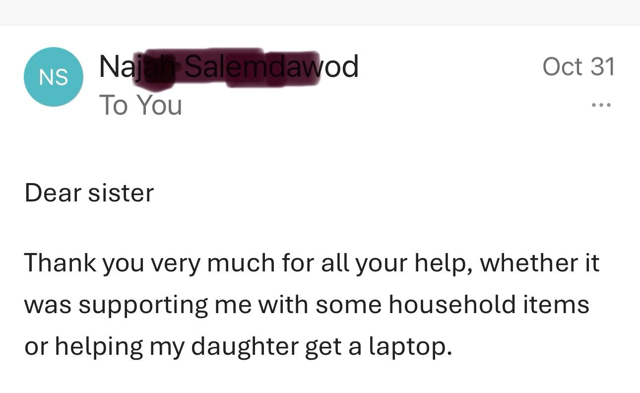 We have been helping the needy families from Gaza, Egypt, Morocco, Jordan, Turkey etc , most of whom Sister Eman has met and knows personally and has been providing support.